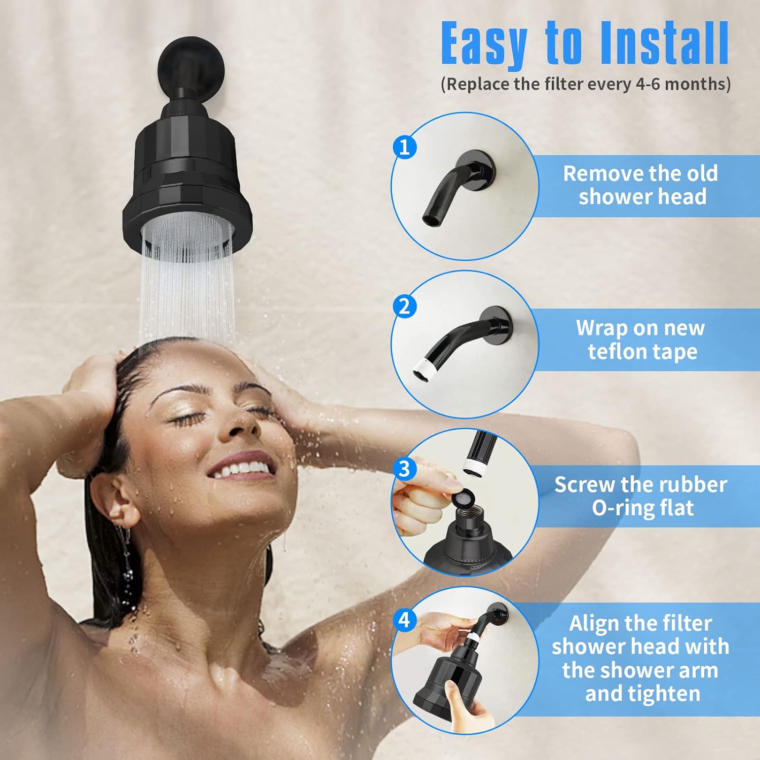 Installez-le vous-même en toute simplicité dans n'importe quelle douche standard ! Aucun outil requis : un simple raccord serré à la main et un peu de ruban de plombier inclus suffisent. Aucune fuite ni fissure.