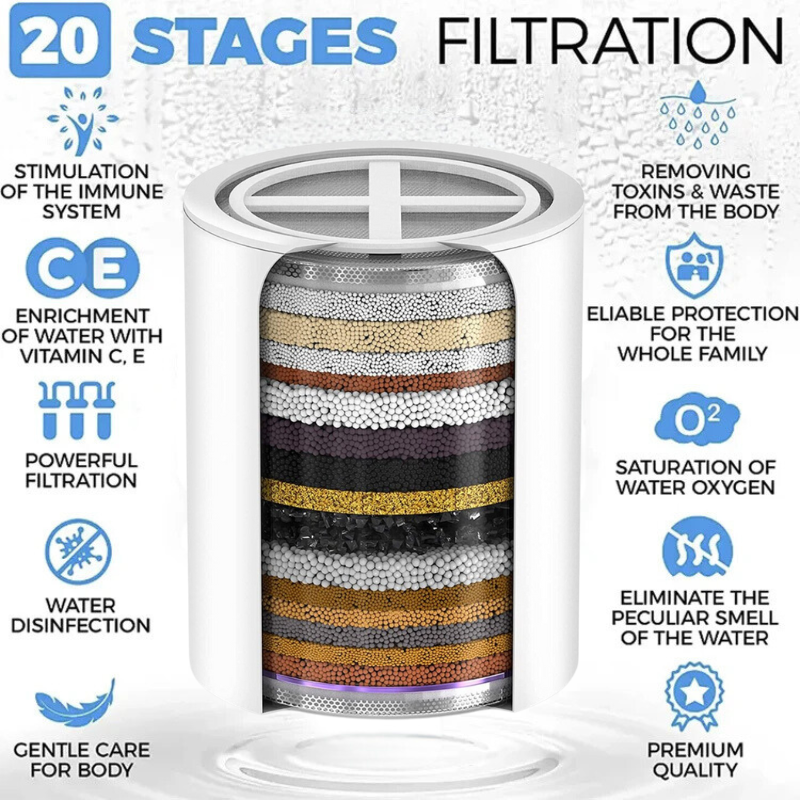 Système de filtration innovant en 20 étapes comprenant des pierres minérales ioniques, de l'ABS (acrylonitrile butadiène styrène), du coton PP, de la vitamine C, du KDF 55 et plus encore pour adoucir l'eau dure et éliminer les éléments indésirables comme le chlore, les bactéries, la saleté et la rouille.